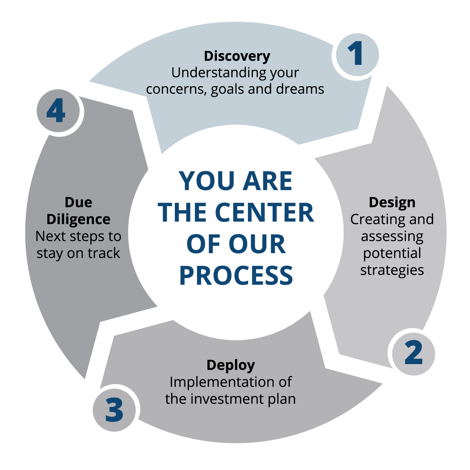 Circumstances can and will change for clients. Whether your goals and objectives have evolved, you’re worried about market volatility, or you’d just like reassurance that you are on the right path, we are committed, to being available to you. If you think it might be time to make changes, we can start the process again to help keep you on track.